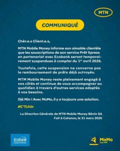 MTN Mobile Money a annoncé sur ses réseaux sociaux, dans la soirée de ce mardi 31 mars 2026, la suspension temporaire de son service Prêt Xpress à partir du 1er avril 2026. Les clients sont cependant rassurés que le remboursement des prêts déjà octroyés n’est pas concerné.